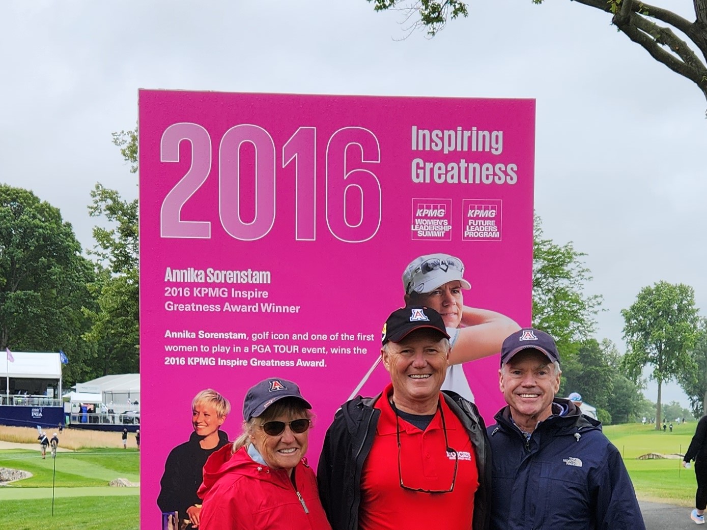 In front of UA great Annika Sorenson's poster at the 2023 woman's PGA Championship at Baltusrol NJ