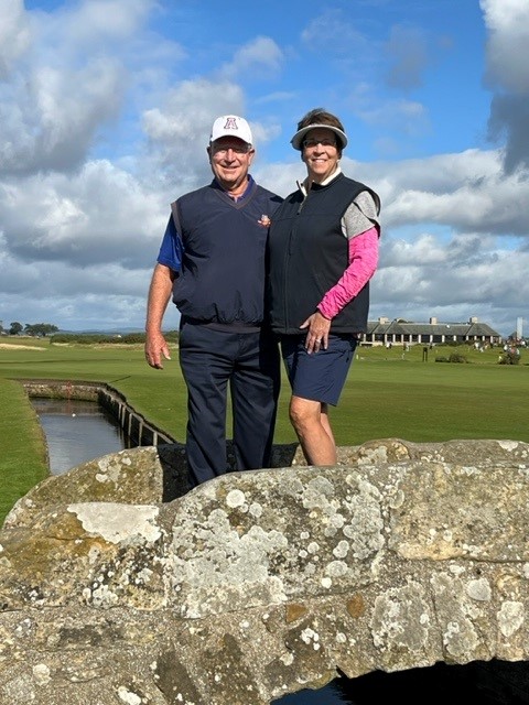 Andy and Gary Harper on the Swilcan bridge at St. Andrews Old Course, Scotland, September 2023