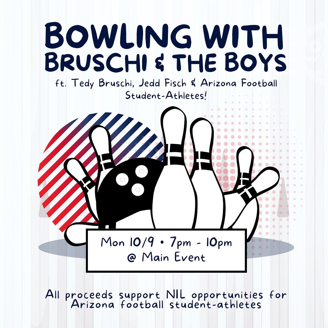 Are you ready to strike up some fun with Tedy Bruschi and the Wildcats? Join us for an epic evening of strikes, spares, and a whole lot of entertainment as Desert Takeover Football Collective teams up with Arizona alum Tedy Bruschi to bring you the ultimate bowling experience at 7 p.m. (MST) on Monday, Oct. 9 at Main Event Tucson.